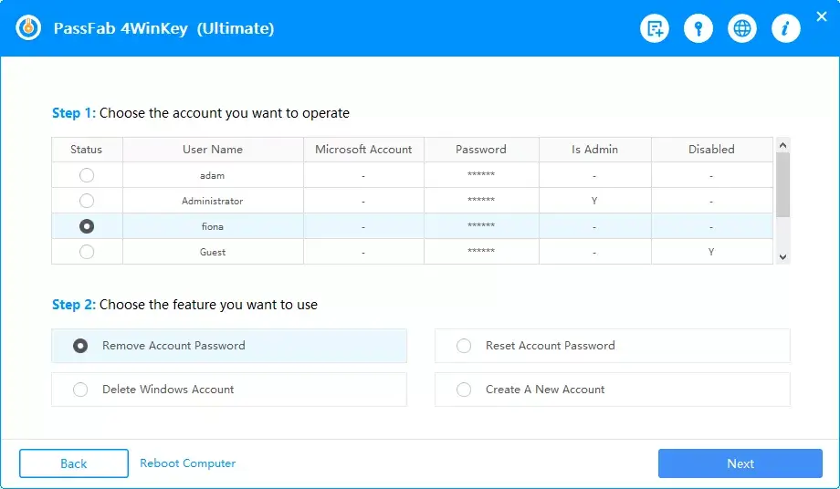 Step 7: Select your user account, which you wish to reset the password, and select the “Remove Account Password” option from the following: “Remove Account Password,” “Reset Account Password,” “Delete Windows Account,” or “Create A New Account.”.